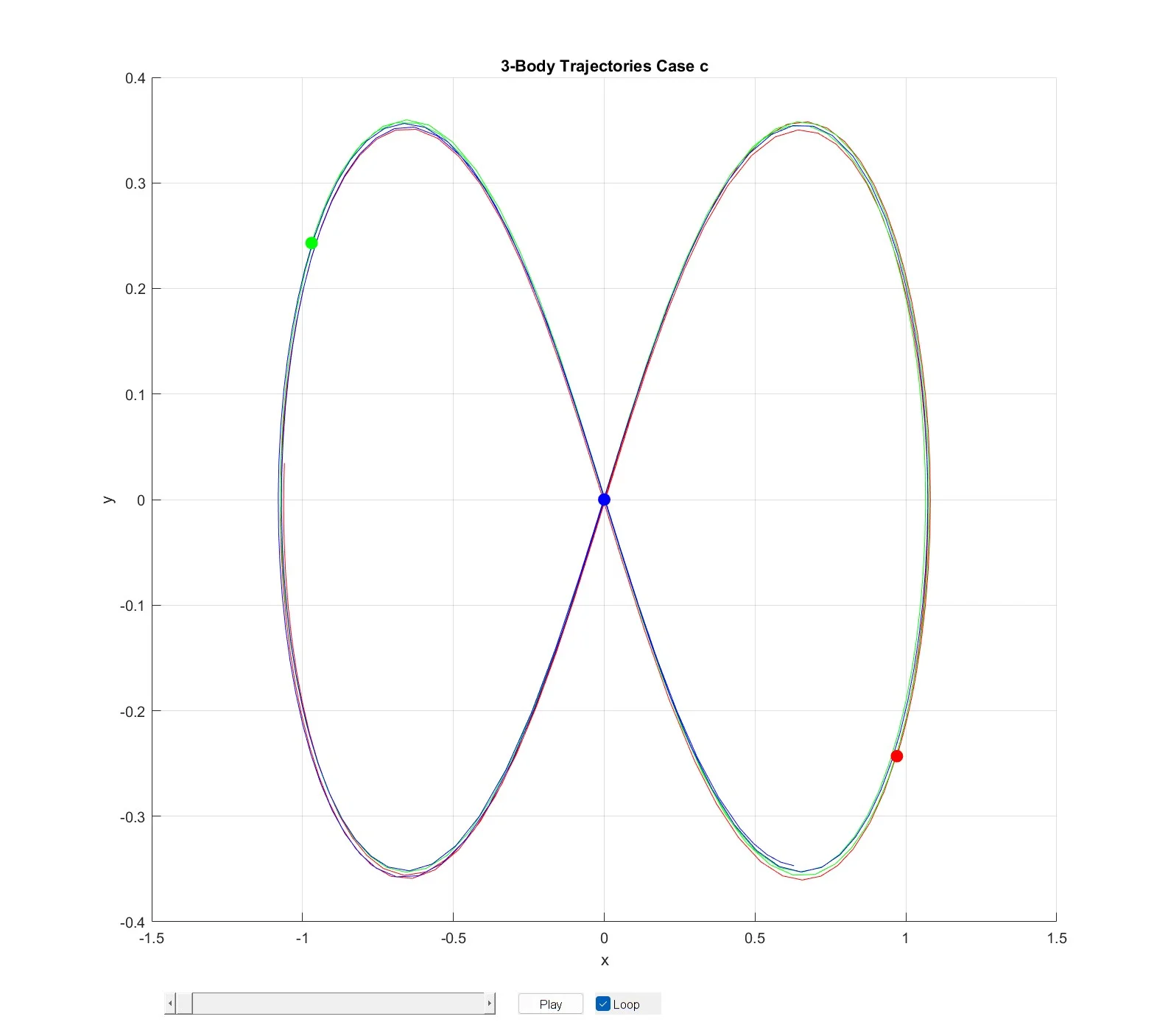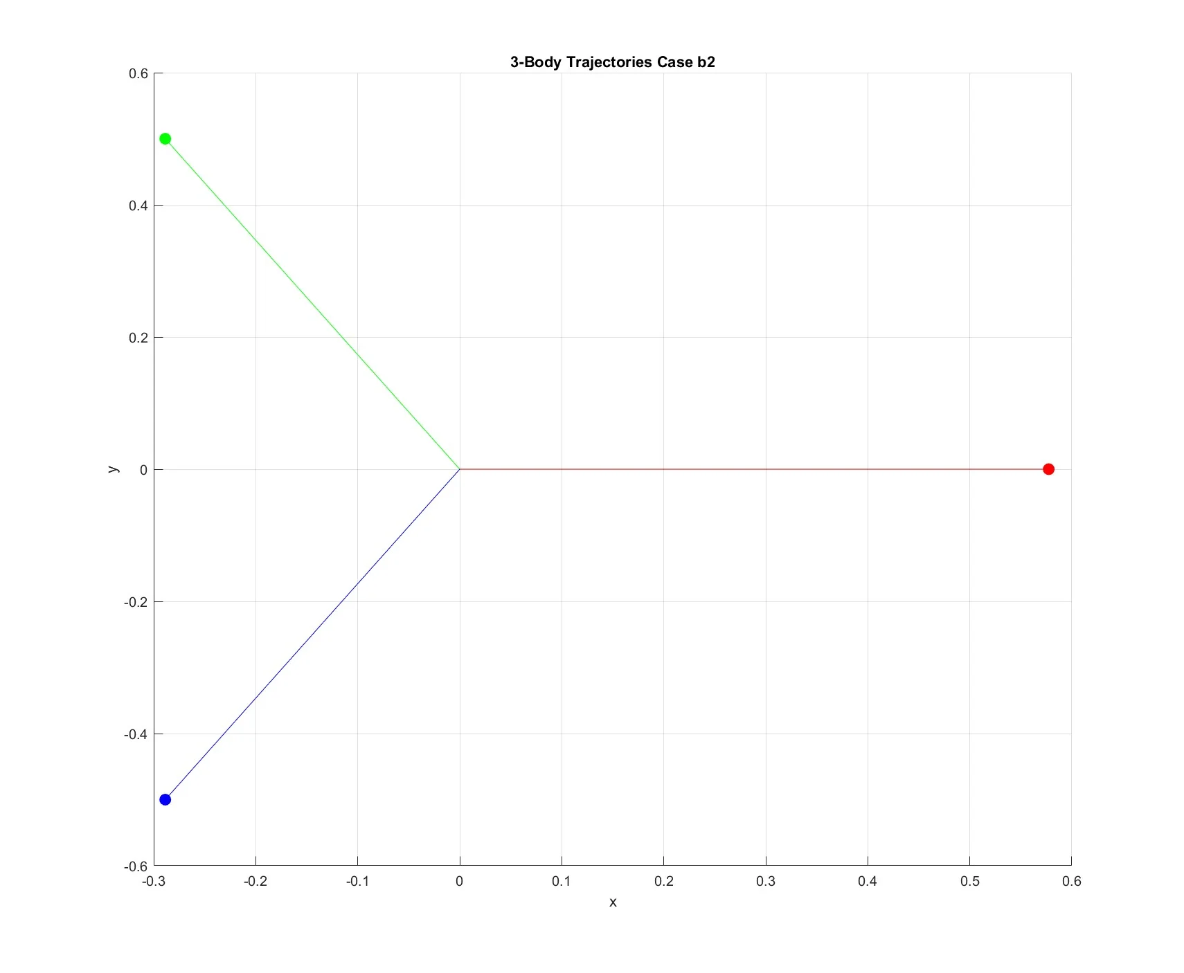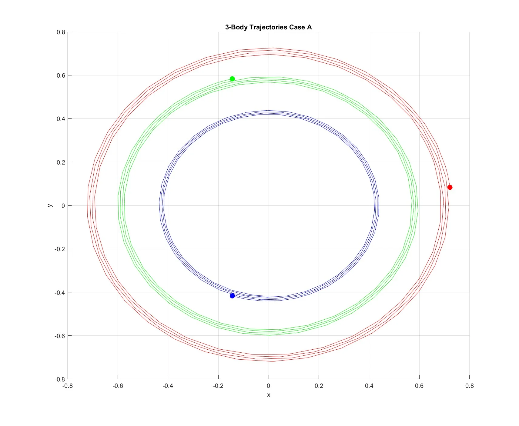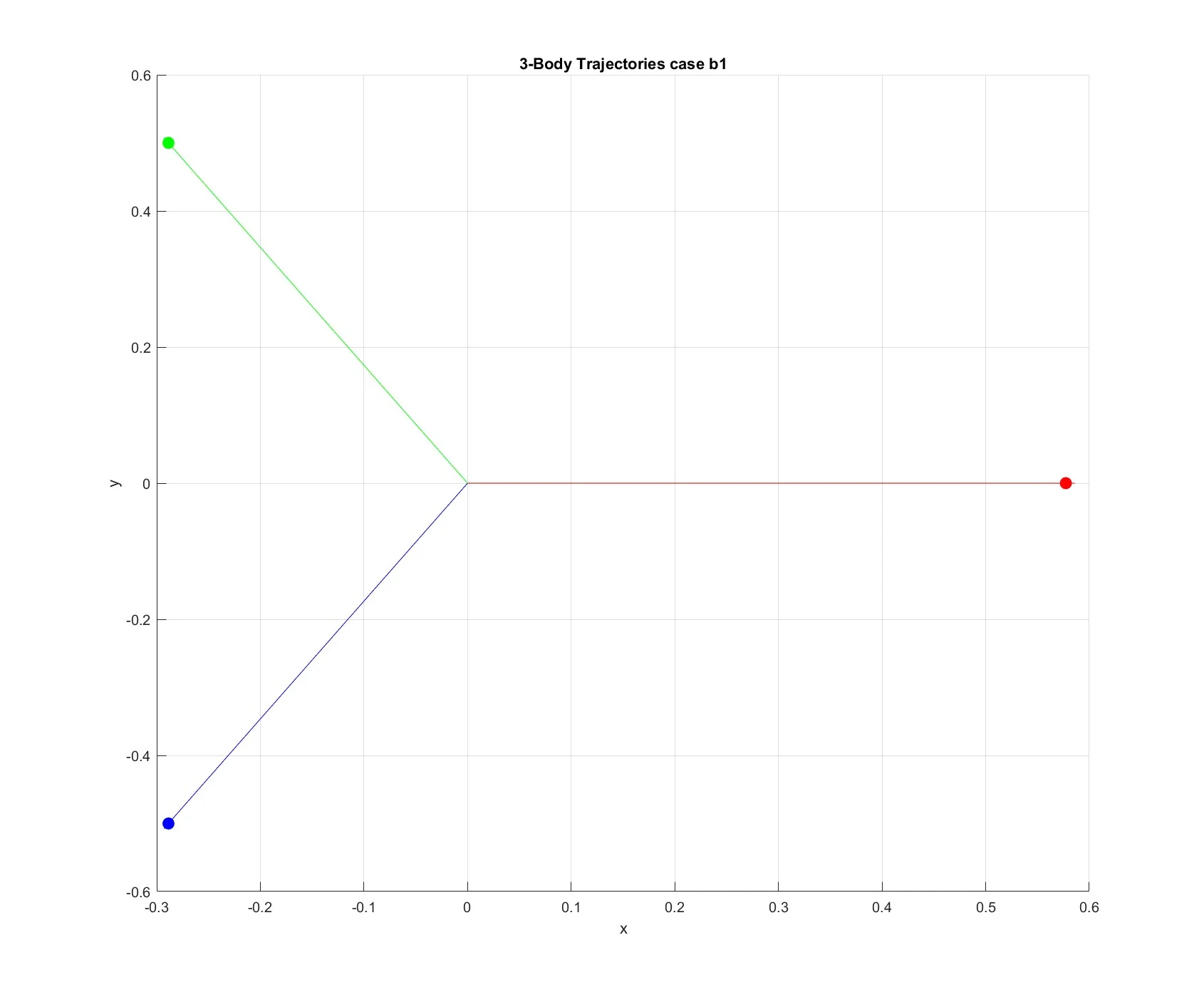 This MATLAB script was made in fall of 2025 as my computational project for Classical Mechanics 1. It plots the predicted trajectories of the three bodies in simple planar three-body problems up until t=10.