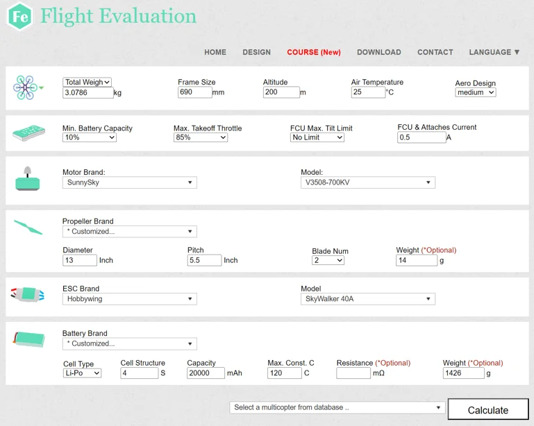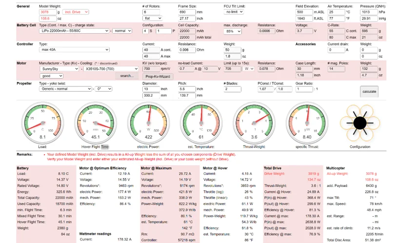 One thing that really helped with confirming our component build were online tools that would calculate TWR, flight time, efficiencies, and potential payload weights given motor, battery, and ESC selection. The two that I used were flyeval.com and xCopter.