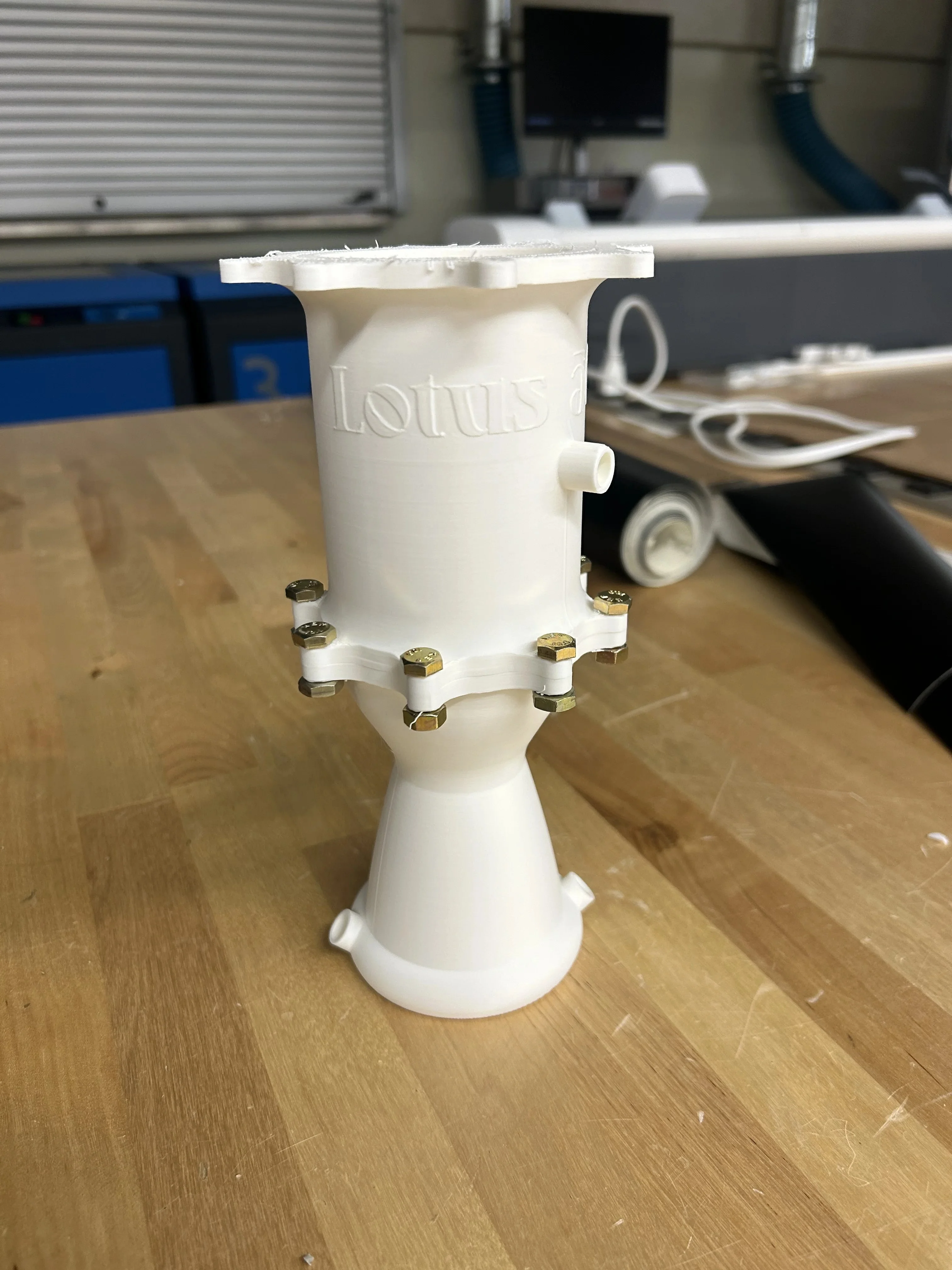 Lotus is a personal project to challenge and expand the design skills I have developed so far, taking full advantage of on-campus additive manufacturing to produce complex internal geometries that would otherwise be unmanufacturable. Having direct access to the printer as "owner/operator" provides a significant advantage: unlike other university teams that must outsource production overseas, pay exorbitant prices (up to $20,000), or rely on rare partnerships, I am able to iterate rapidly, refining each design cycle and letting Lotus grow.