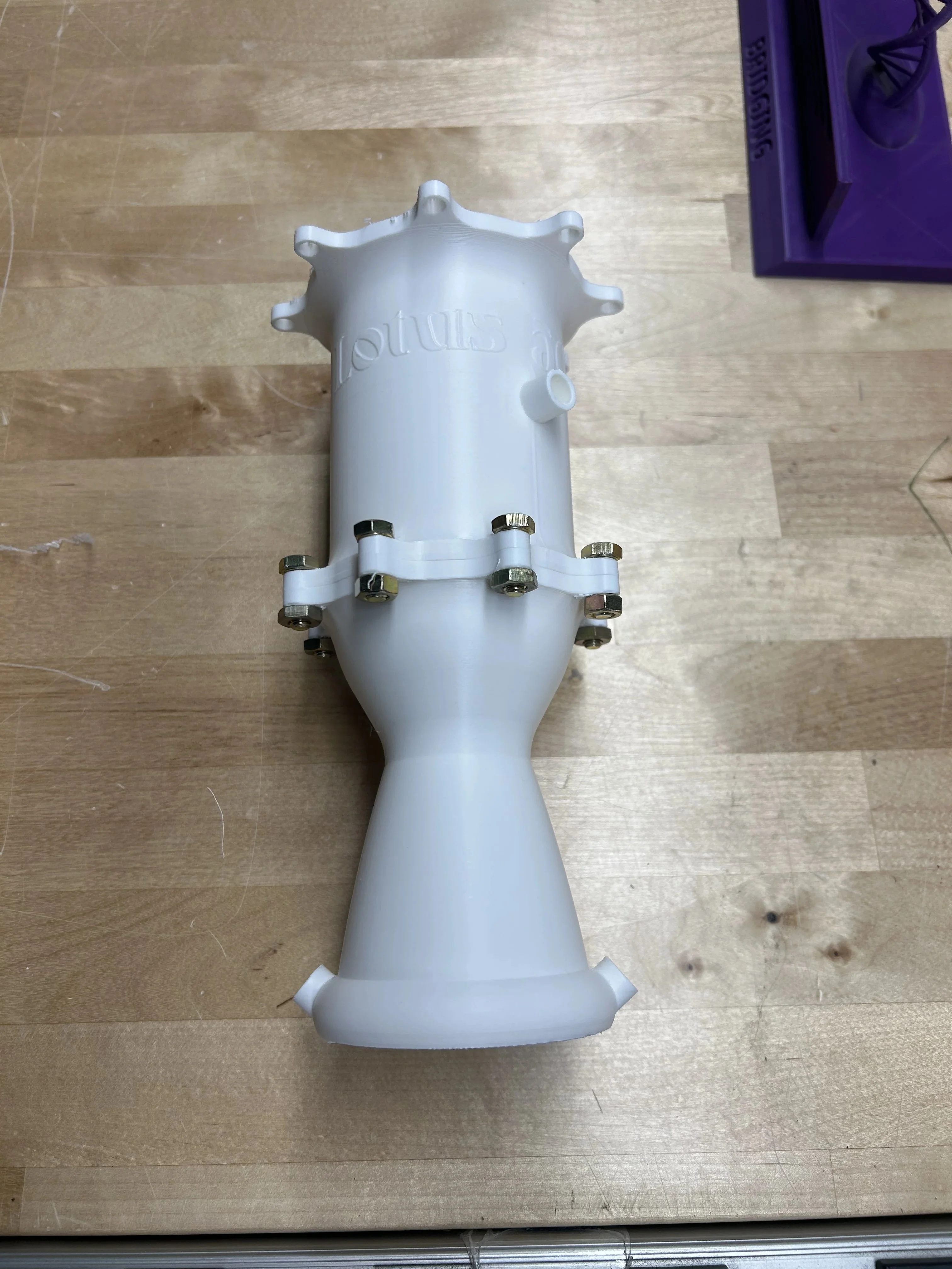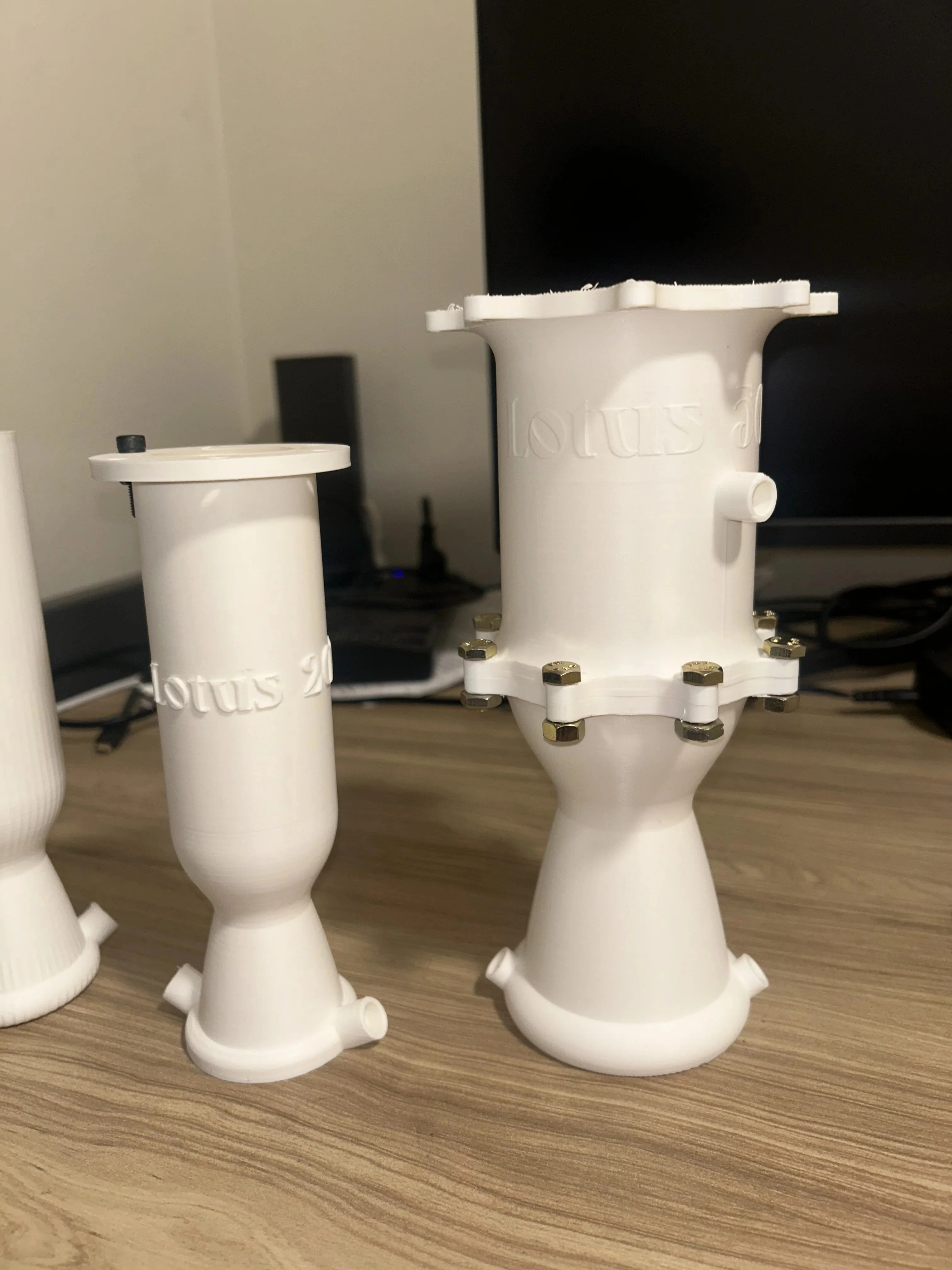 To finish of design and anlysis for the chamber and nozzle portion of the first iteration of Lotus, PLA prints were made to verify feasibility of bolt holes, npt taps, regen channels, and get a general gauge of the engine's size.