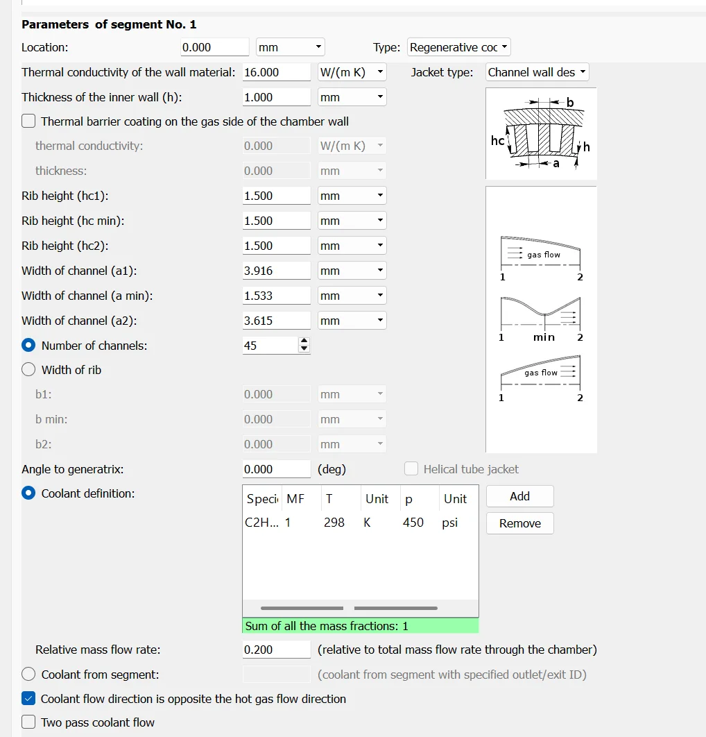 With those parameters set, the software Rocket Propulsion Analysis was used to get the chamber curve and geometry as well as simulate expected temperatures under different cooling regimes. These values were used to derive max yield stresses which were then cross-checked with hand calcs of Hoop Stress and SolidWorks's FEA study feature. Positive margins of safety were achieved and temperatures indicated that the steel would not melt.